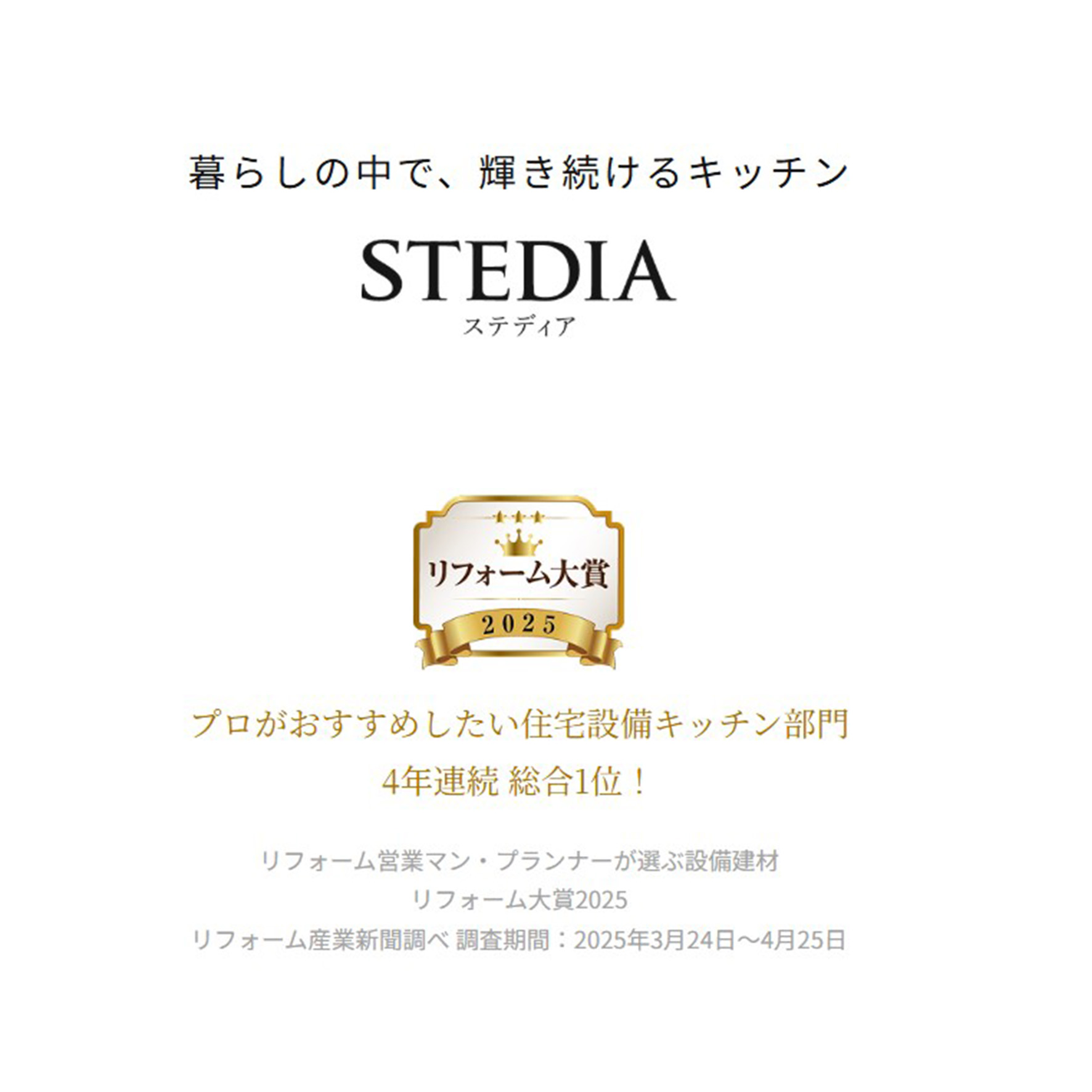 Stedia蟬聯日本專業人士票選「住宅設備:廚房部門」連續4年冠軍肯定。
